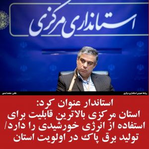 ?استاندار مرکزی اذعان داشت: زمینه بسیار خوبی برای نیروگاههای خورشیدی در استان وجود دارد و به لحاظ زاویه تابش بهترین بازدهی و بهرهوری را در کشور داریم که یک مزیت بسیار خوب برای سرمایهگذاری در این حوزه است.