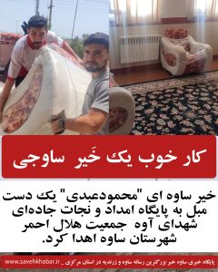 خیر ساوه ای “محمودعبدی” یک دست مبل به پایگاه امداد و نجات جادهای شهدای آوه جمعیت هلال احمر شهرستان ساوه اهدا کرد.