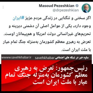 کد خبر : 18123 تاریخ انتشار : 2026/01/19 نسخه چاپی : اندازه فونت : رئیسجمهور: تعرض به رهبری معظم کشورمان بهمنزله جنگ تمام عیار با ملت ایران است رئیسجمهور: تعرض به رهبری معظم کشورمان بهمنزله جنگ تمام عیار با ملت ایران است