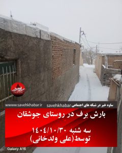 کد خبر : 18135 تاریخ انتشار : 2026/01/20 نسخه چاپی : اندازه فونت : بارش برف در روستای جوشقان نوبران 🌧 بارش برف در روستای جوشقان 🔹سه شنبه ۱۴۰۴/۱۰/۳۰ 📸 توسط(علی ولدخانی)